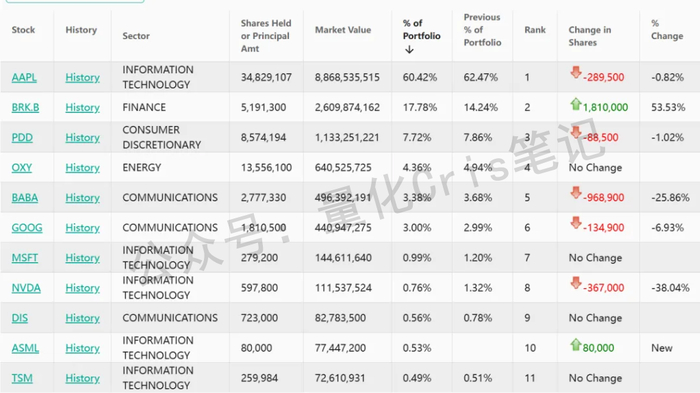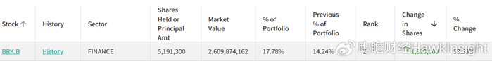 去年三季度,他明显加码了伯克希尔·哈撒韦,仓位比例跃升到接近18%。