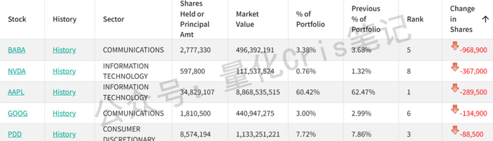 相对应的,是对高弹性资产的主动降温。他对英伟达和阿里巴巴的减持幅度都超过25%,拼多多则选择按兵不动。