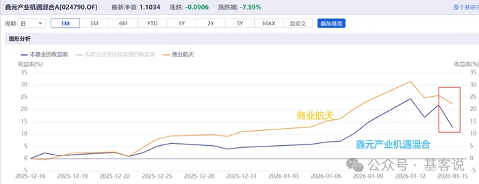 再看同样大跌超 7.5% 的鑫元产业机遇混合:2025 年底开始也和商业航天走势沾边,但仓位应该不重。