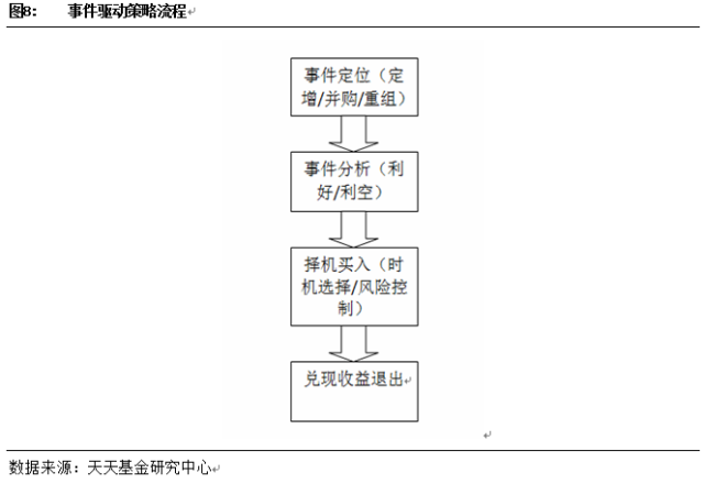 事件驱动策略是指在前期深入挖掘和分析可能造成特定公司证券价格异常波动的特殊事件的基础上,通过充分把握交易时机获取超额投资回报的交易策略。常见的事件驱动类投资策略包括定向增发、兼并收购、ST摘帽、年报高送转、业绩超预期等等。例如预计某公司年报高送转或业绩超市场预期,则可提前潜伏买入该公司股票(交易时机),等事件明朗或将要明朗(发展进程)且市场充分反映预期时逢高卖出获利。国内最常见的事件驱动策略为定向增发策略,即以一定折价认购其看好的某公司发行的定增股票,待锁定期满后在二级市场溢价卖出获取收益。