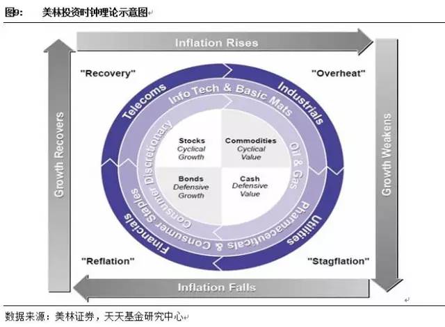 市场上比较著名的宏观资产配置模型为美林证券于2004年提出的投资时钟模型。该理论将经济周期划分成四个阶段:衰退、复苏、过热和滞涨,在复苏周期经济开始增长,同时保持较低的通胀水平,此时表现较好的资产为股票;在过热周期经济增长开始放缓,同时通胀抬头,此时表现较好的资产为大宗商品;在滞涨周期经济增长率降低至潜能之下,通胀继续上升,股票与债券的表现均不好,此时适合持有现金;在衰退阶段,经济开始衰退,通胀走低,此时表现最好的资产为债券。该模型通过在全球范围内不同资产间轮动配置获取超额收益。