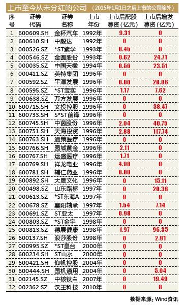 ■ 2011年前上市的公司中,共有32只个股自上市之后从未实施过现金分红。尤其是其中的23家公司,上市时间已经超过20年。这些“铁公鸡”虽然一毛不拔,但圈起钱来却毫不含糊