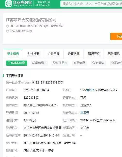 不用面试就能进入国际名企实习,奶茶妹妹令同龄人羡慕的待遇远不止于此:还在上大四时,章泽天就有了以自己名字注册的公司——江苏章泽天文化发展有限公司。据企业查询宝查询到的信息显示,该公司注册于2014年12月5日,注册资本为1000万元,主要经营文化产业投资、电视节目制作发行等。地点在江苏省宿迁市宿豫区京东信息科技园一期商业街,而这也正好是京东全国客服中心所在之处。