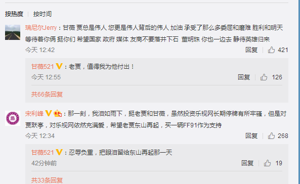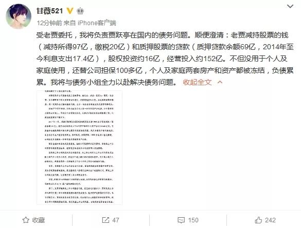 随后,贾跃亭妻子甘薇转发贾跃亭对北京证监局的回函称,受贾跃亭委托,将负责贾跃亭在国内的债务问题。同时,甘薇称,贾跃亭“减持股票的钱(减持所得97亿,缴税20亿)和质押股票的贷款(质押贷款余额69亿,2014年至今利息支出17.4亿),股权投资约16亿,经营投入约152亿。不但没用于个人及家庭使用,还替公司担保100多亿,个人及家庭两套房产和资产都被冻结,负债累累”。甘薇称将全力以赴解决债务问题。