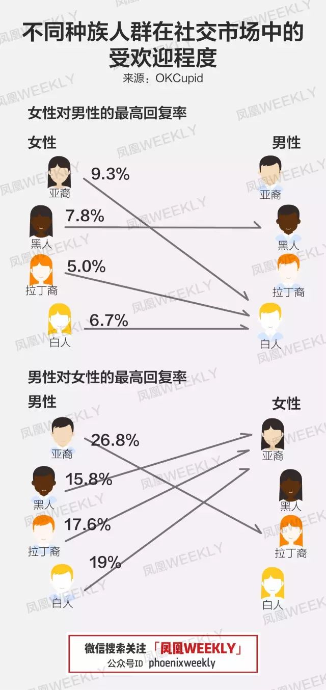 在线约会网站OKCupid曾做过统计,发现亚洲女性是唯一一个在各人种男性眼中,魅力值高于平均水平的人种,连续多年都处于约会食物链的顶端,这与西方社会对亚洲女人具有“顺从的性对象”的刻板印象有关。