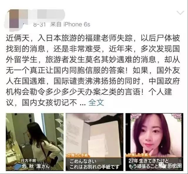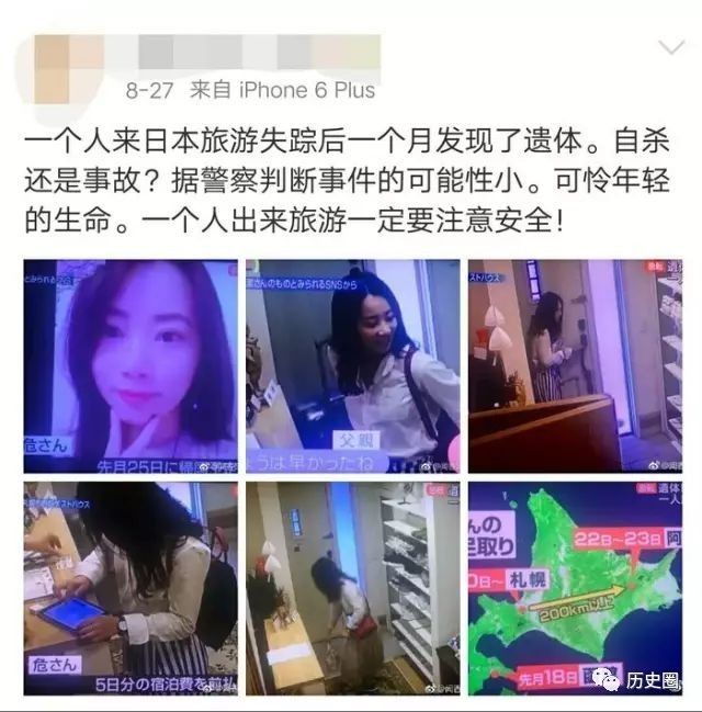 前段时间网上大家讨论的沸沸扬扬的福建女教师在日本旅游失踪,最后尸体被找到,日本警方给出的是自杀的答复。