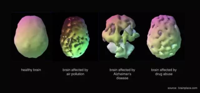 ▲ 左起图一为健康的大脑,图二三四依次为被空气污染、老年痴呆症以及毒品侵蚀的大脑。