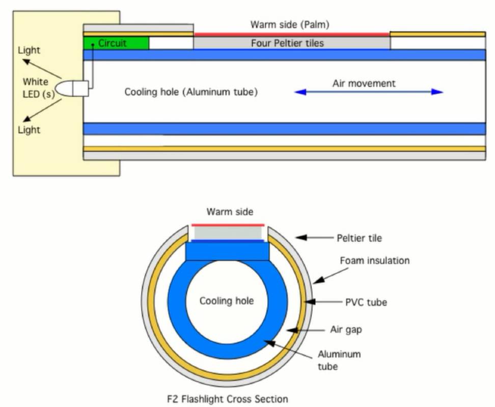 “这个手电筒不需要电池或任何化学物质,也不需要人力发电,没有噪音和震动。唯一的缺陷是需要至少5℃温差才能发光。”