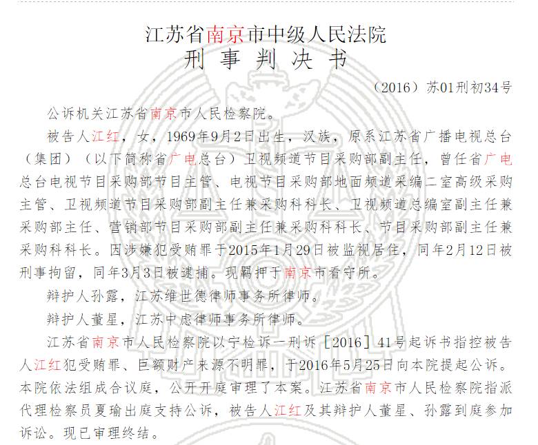 围绕着电视剧采购过程并非鲜见的行贿、受贿行为,最终将曾担任江苏省广电总台卫视频道节目采购部副主任等职的江红拉下马。