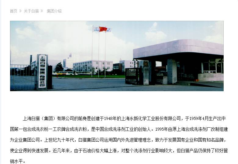 白猫品牌是国内日化行业的老字号品牌。其中,白猫集团前身是创建于1948年的上海永新化学工业股份有限公司,于1959年4月生产出中国第一包合成洗衣粉—工农牌合成洗衣粉。目前白猫集团隶属于上海市徐汇区国资委。
