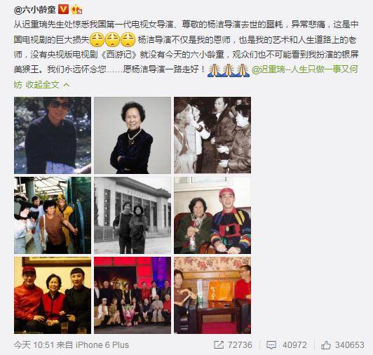 从迟重瑞先生处惊悉我国第一代电视女导演、尊敬的杨洁导演去世的噩耗,异常悲痛,这是中国电视剧的巨大损失。 杨洁导演不仅是我的恩师,也是我的艺术和人生道路上的老师,没有央视版电视剧《西游记》就没有今天的六小龄童,观众们也不可能看到我扮演的银屏美猴王。我们永远怀念您……愿杨洁导演一路走好!