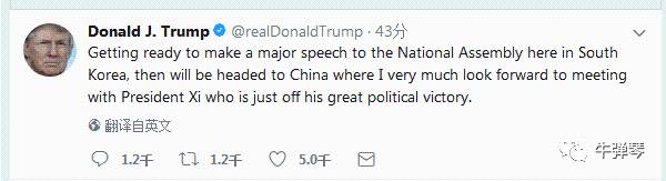 在日本和韩国,特朗普也发推特,但第一推都是关于驻外美军的,只有到中国,特朗普才真正感受到了宾至如归。