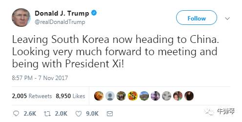 来中国之前,在韩国,特朗普就已经“二连发”,表达了对即将到中国来激动心情。