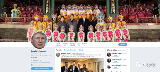 心情激动之余,特朗普立马将自己推特最上面的背景图片,换成了和中国演员们的合影。