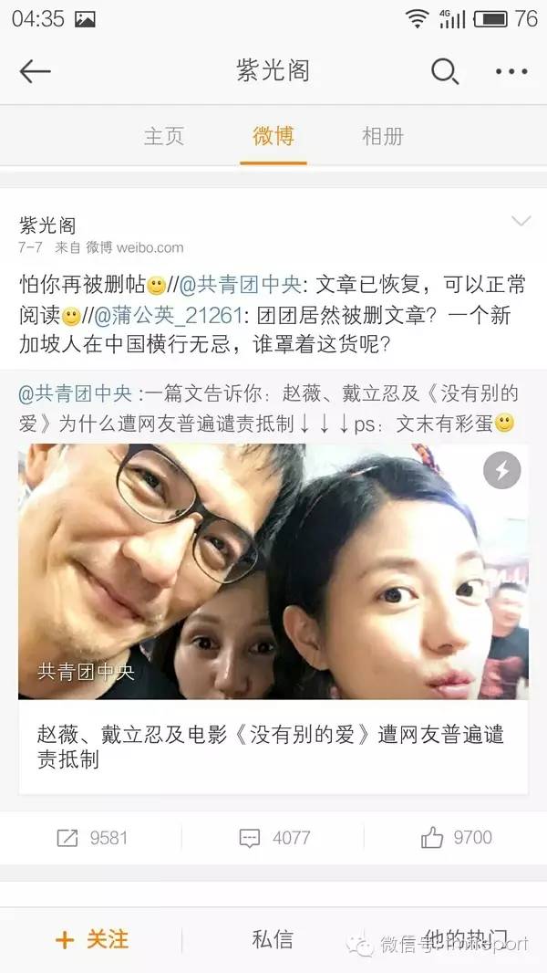然后网友们就怒了啊,号召抵制赵薇新电影,据传赵薇就开始公关,在微博上面删有关言论,强压这一事件。