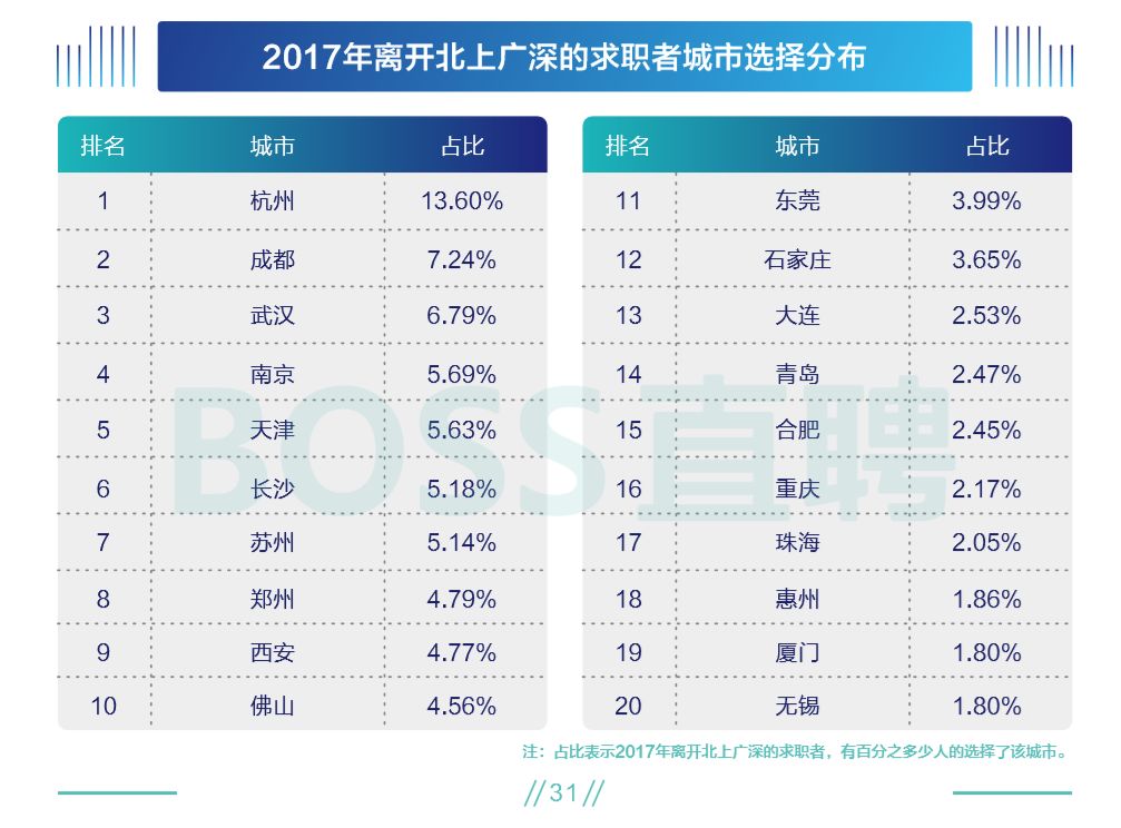 白皮书显示,从一线城市人才流出方向来看,深圳、上海、广州求职者下一份工作地区集中度相对较高,超60%的人选择周边二线城市及南部地区。而北京求职者下一份工作地区分散度最高,其范围横跨西南和东部沿海城市,几乎辐射半个中国。