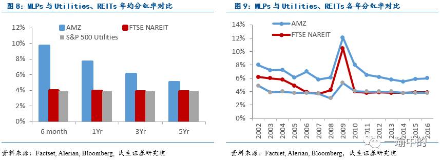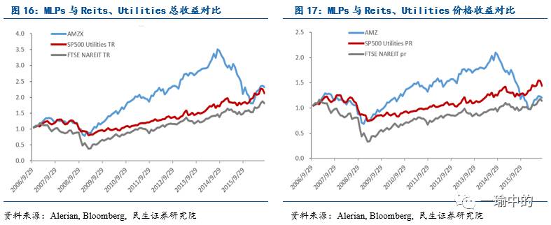 MLPs经常被拿来与Reits和Utilities对比(Reits指数选取为FTSE NAREIT US Real Estate Indices Index,Utilities指数选取为S&P 500 Utilities指数)。