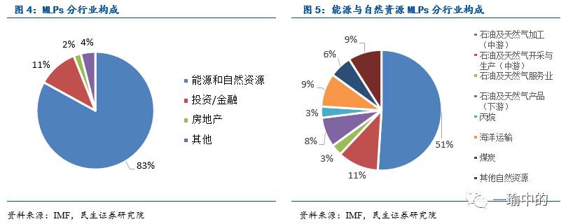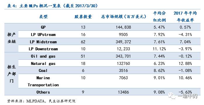 MLP主要集中在能源行业。从开发、加工、储存、运输到最后销售来分,能源行业可以分为上游MLP、中游MLP和下游MLP,目前主要以中、上游为主。