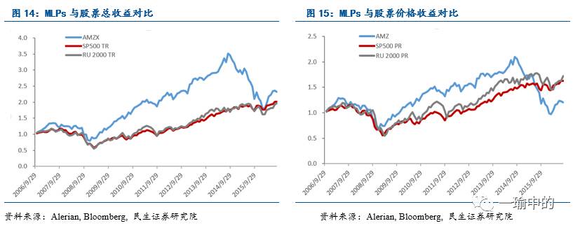 总收益=价格收益+分红收益,因此对比总收益和价格收益可以看出,MLP总收益打败股票主要依靠分红。以2006年作为持有期起点,2015年底MLPs价格收益指数开始低于标普500和罗素2000指数,但MLPs总收益指数仍然高于标普500指数和罗素2000指数,这得益于MLPs较高的分红率,2015年AMZ指数分红率约为6%,同期普通股票分红率不到4%。
