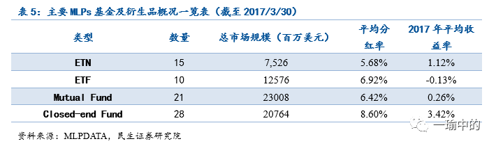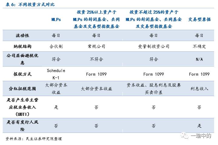 MLP间接投资主要为投资MLP基金及相关金融衍生品,一般来说有以下几种方式:MLP封闭式基金(closed-end funds)、MLP共同基金(mutual funds)、MLP交易型指数基金(ETFs)和MLP交易型票据(ETNs)。