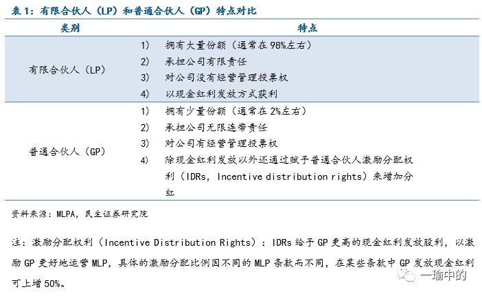 大多数MLP由两类合伙人构成:有限合伙人(LP)及普通合伙人(GP)。当投资者购买了MLP股票,即成为了公司的有限合伙人(LP),凭借买卖股票份额,按现金红利发放等方式获利。同时,市场上也有一部分可以公开交易的普通合伙人股票(GPs)供投资者投资。