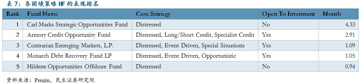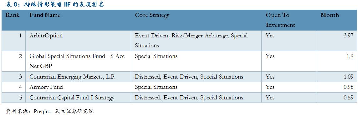 目前市场表现最佳的distressed HF为Carl Marks Strategic Opportunities Fund,到期收益率达16.99%,今年6月单月收益达到4.33%,但是目前已经进入封闭期,投资者无法申购。而表现最好的special situation HF是ArbitrOption,其月收益也高达3.97%,此榜单上的基金皆可进行申购。