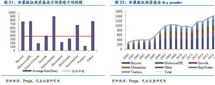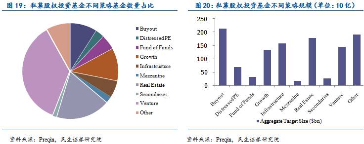 采用困境投资策略的私募股权基金数量不多,但平均规模大:根据Preqin对私募股权基金策略的划分,可以将私募股权基金分为10类(如下图),其中困境投资(distressed PE)基金数量占比2.9%。但就基金平均规模而言,采用困境投资策略的基金的募集资金量达到7.72亿美元,这一数字接近均值3.82亿美元的一倍,高居所有私募股权投资基金的第二位。
