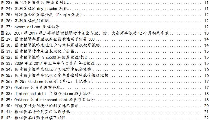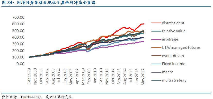 困境投资策略表现好于股市和其他策略:2000-2016年末期间,困境投资私募股权基金累计回报率达到536.7%(同期标普500为210%),在私募股权基金所有策略中排名第一。1999年1月至2017年7月,困境投资对冲基金累计回报率达到604.5%(同期道琼斯工业指数为245%),在对冲基金其他策略中排名第一。