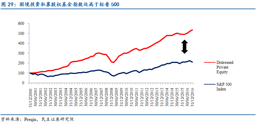 私募股权策略中,困境投资策略表现优于股市表现:2000-2016年末期间,困境投资策略的指数表现远高于标普500,累计回报率达到536.7%,同期标普500的累计回报率仅为210%。