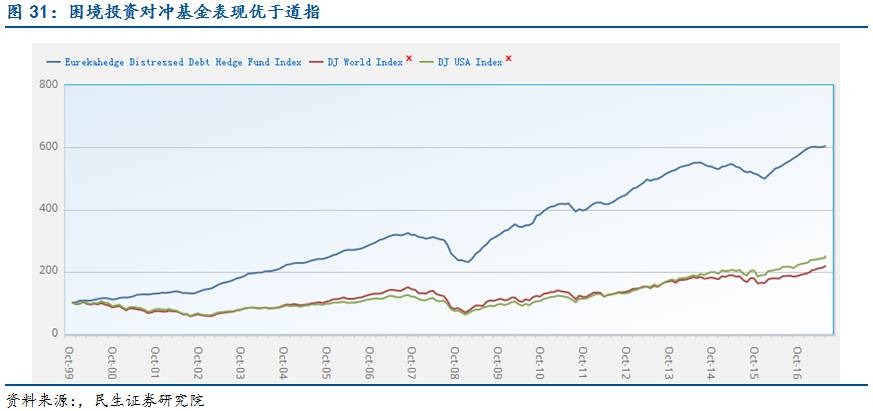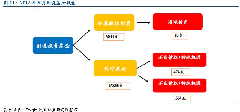 可投资基金总量有限:虽然对困境基金的配置需求旺盛,但困境资产的行业门槛高,能参与交易并处置不良贷款的金融机构有限,可以投资的基金总量不高。截止2016年底,专注困境投资的私募股权基金仅有89支,困境投资策略的对冲基金有805支。在供需失衡的背景下有望促使更多的困境基金发行。