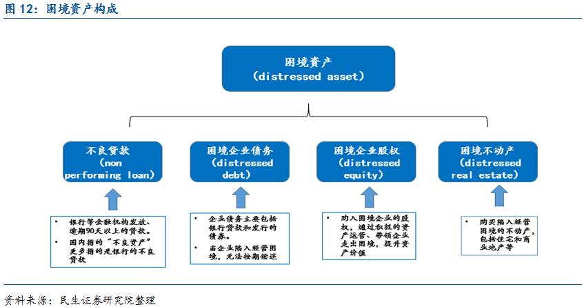 困境投资基金(distressed fund)又名秃鹫基金是指专注于困境资产投资的基金。困境资产既包括不良贷款,也包括困境企业的债务/股权和经营困境的不动产(如下图)。困境投资基金会折价买入陷入困境的资产,通过未来资产的盈利能力和现金流的修复进行获利。