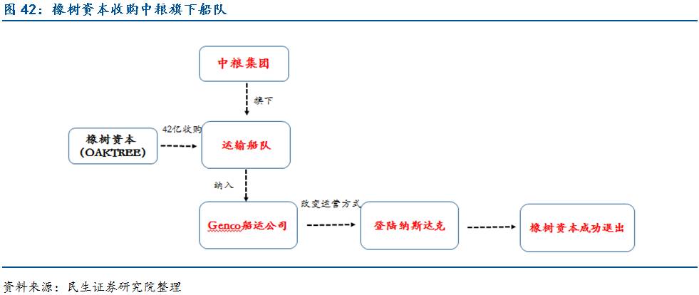 橡树资本收购经营不佳船队,调整业务方向,改善资本结构,最后上市完成退出:2004年中粮集团的海外运输团队经营不佳(管理不佳+运营效率不高)。橡树资本向中粮集团发出了收购要约,最终于2004年底以4.2亿美元的价格买下该运输团队,并以此为核心资产注册了一家船运公司Genco。橡树资本接手船队后,改变经营方式,船只从自营改为出租,运输送铁矿石、煤炭和谷物,船队规模也从16艘扩大到20艘。2005年5月,Genco登录纽约纳斯达克交易所,橡树资本通过IPO成功退出。