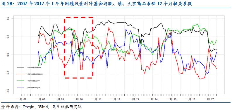 困境资产与传统资产的低相关性:从历史数据来看,困境基金与股票、债券、商品的大类资产地相关度较低,尤其是在资产价格崩塌的金融危机期间甚至是负相关。在投资组合中加入困境基金,既可以在保证收益的同时降低风险,也可以作为经济下行的有效对冲手段。