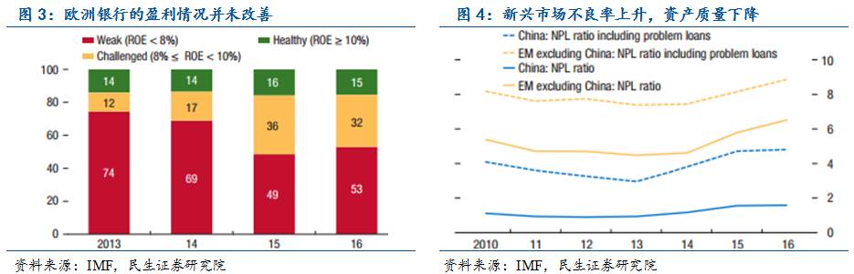 全球范围内债务发行规模过大,但偿还能力不足:美国从2010年以来企业新增债务总规模高达7.8万亿美元,但是这些负债经营的公司支付各类债务利息的资金实力却下降至2008年以来的最低水平。2016年美联储货币政策转向紧缩,金融环境恶化对私营企业的冲击恐将逐渐显现;欧洲地区债务总额长期维持在高位,银行业是最大风险,2016年欧盟银行业不良率仍高达4.3%,未来随着欧洲货币政策的正常化,银行业未来增收难度加大,面临更大的转型压力,将有大量的不良资产需要剥离;许多新兴市场国家的负债总额也开始迅速上升。根据彭博统计,今年以来,美元计价的新兴市场企业票据发行规模已经攀升至1600亿美元,创下历史最高开年债券发行速度。在经济发展和财政收入过度依赖大宗商品市场行情的新兴市场国家中,一旦大宗商品价格再度进入熊市,一些国家的债务违约风险将迅速上升。
