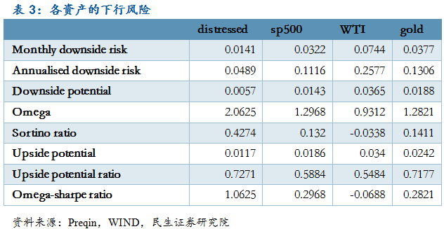 困境投资对冲基金的风险相对较低:对比困境投资对冲基金与股票、原油、黄金的downside risk 和VaR,可以发现困境HF在正常波动下遭受极端损失更低,也更为稳健。