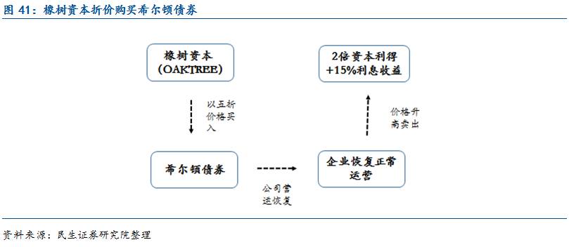 橡树资本低价买入困境公司债券,等待价格恢复赚取差价:2008年的金融危机中,希尔顿的经营业绩一落千丈,现金流入不敷出,所有者黑石迫于流动性压力,将不良债权打包出售。橡树资本判定当前希尔顿的债券受到低估,资产仍然优质,就以5折的价格买入这批不良债权。金融危机余波之后,希尔顿经营业绩恢复,债券价格一路走高,企业破产预期逐渐烟消云散,橡树资本成功退出,获取了2倍资本利得与票面利息。