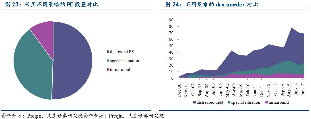 1)不良债权(Distressed Debt)策略:是指以折扣价格来获取未来有增值潜力的债务类有价证券或者特定资产的控制权,并在未来特定时点退出获利的策略。不良债权策略是困境投资私募股权基金采用最多的策略,89家distressed PE中,有近一半是采用distressed debt策略,2000年以来dry powder(可投资金)一直呈上升趋势。