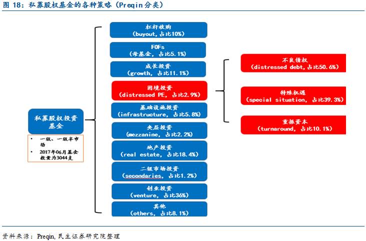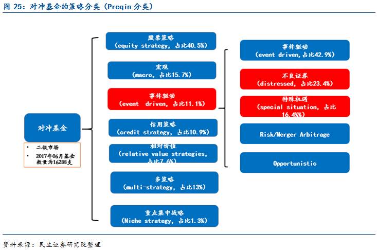 对冲基金中,困境投资策略属于事件驱动策略其中的一种:困境投资策略(包括不良证券和特殊机遇策略)是对冲基金事件驱动策略的一种。根据Preqin数据显示截至2016年末,市场上现存对冲基金共计16288支,其中采用事件驱动策略的基金有1810支