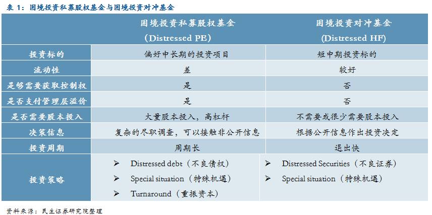 采用困境投资策略的冲基金和私募股权基金在投资周期、流动性、控制权等方面都有差异:困境投资私募股权基金更倾向于长期投资(购买困境证券后,帮助公司完成资产重组,完善治理结构,设计发展策略,并最终通过重新上市或者并购来实现高额回报);而困境策略对冲基金的投资周期相比较短,较多关注困境证券本身产生的交易机会。另外从流动性、对公司控制权和管理层的要求、对股权和杠杆的应用等两者都有区别,但是目前市场上困境投资私募股权和对冲基金的差异正变得十分模糊。