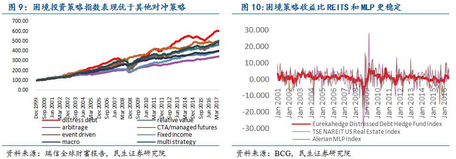 困境策略优异的表现并不局限于经济危机时期,2000年以来不论是采取困境投资策略的私募股权基金还是对冲基金,其表现不仅优于同期股市表现,还好于同类别的其他策略。