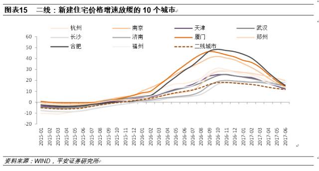 第二,一二三线城市房价的上涨具有“示范效应”。其中,一线城市反弹快、涨幅高,但回落幅度也较大。二线城市增长幅度和节奏分化较大,10个热门城市:合肥、厦门、南京、杭州、福州、郑州、天津、武汉、济南、长沙的房价增速开始大幅回调;另有7个城市:重庆、沈阳、西安、大连、长春、哈尔滨和太原的房价增速仍在上行。三线城市房价整体处于增速上行阶段,但5个热门城市:石家庄、无锡、安庆、惠州、湛江由于前期反弹较快,目前增速已开始下行。