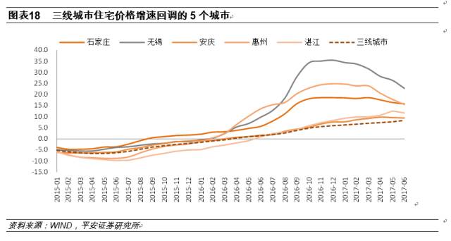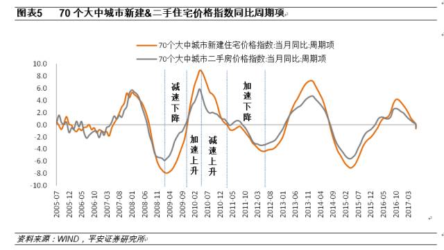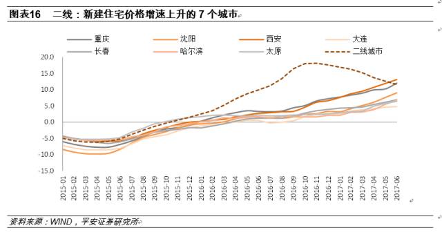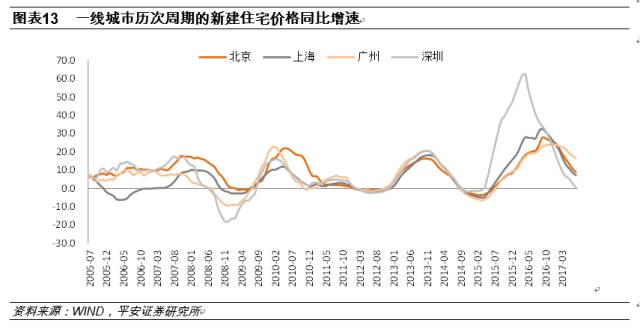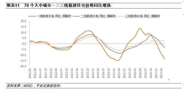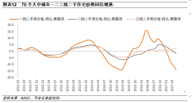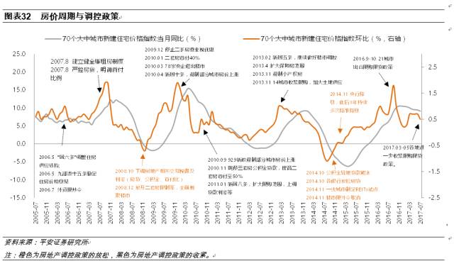 而从本轮房地产周期看,房价的上涨受惠于2014年底开启的一轮货币政策宽松周期,以及2015年以来的一系列房地产调控政策放松;而从2016年“930”调控开始,房价已经进入了下行周期,再考虑2017年3-5月各地再度纷纷出台限购限贷甚至限售政策,以及近期政府着意推广“租售同权”、“集体用地建设租赁用房”等试点,可见,本轮房地产调控政策收紧的方向仍未改变,并且政府正在着意通过长效调节机制的作用,致力于扭转市场对于房价的预期,逐步化解房地产泡沫。因此,当前的房地产调控政策环境很难对房价的上行提供支撑。