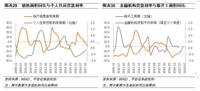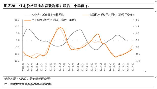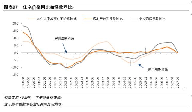 在本轮周期中,房价周期略领先于信贷周期。住宅价格于2015年第一季度进入上行周期,但房地产开发贷款和个人购房贷款于2015年四季度才开始进入上行周期;住宅价格和房地产开发贷款于2016年四季度达到波峰,个人购房贷款滞后一季度于2017年一季度达到波峰。