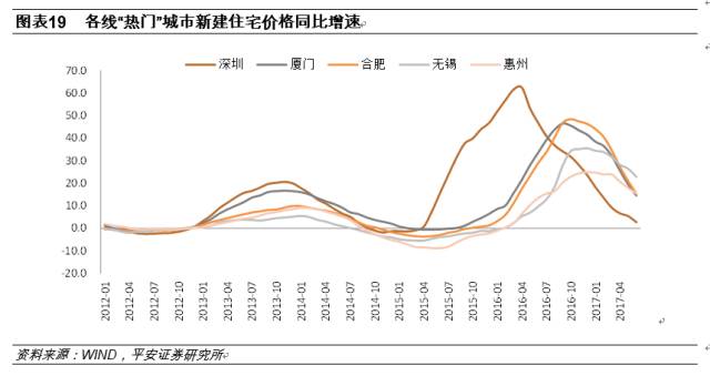 我们选择了各线城市最先反弹、且上涨幅度最大的“热门”城市进行对比。一线城市以深圳为代表,二线城市以厦门和合肥为代表,三线城市以无锡和惠州为代表,结果发现,各线“热门”城市的住宅价格上涨也有一定的先后顺序,深圳的“领头羊”作用明显。目前这些城市都已经进入上涨放缓期。