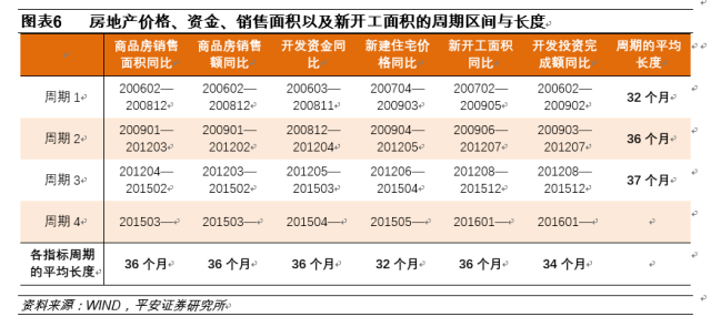 就每一轮的周期长度而言,第一轮周期平均是30个月,第二轮周期平均是39个月,第三轮周期平均是37个月。就每一个指标而言,商品房销售面积与销售额同比、房地产开发资金同比增速、房地产新开工面积同比的周期长度平均是36个月,房地产开发投资同比的周期长度是34个月,70个大中城市新建住宅价格同比增速的周期长度是32个月。也即,我国的房地产周期大致在三年左右。