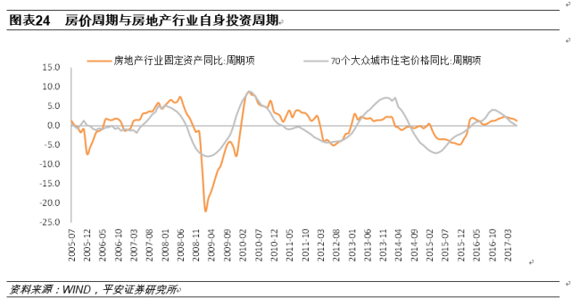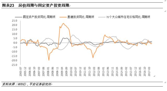 其二,房价同比与整个社会的固定资产投资同比之间的关系分两个阶段:在2012年之前,二者更多是负相关关系,2012年至2016年间二者又表现为同步的正相关性。我们将固定资产投资进一步分解,考察房价与基建投资之间的关系:在2012年之前,二者呈现负相关性,这主要是由于在投资驱动增长的模式下,基建投资更多地是作为房地产开发投资的对冲因素,两者表现为此消彼长的关系;在2012年后,经济与投资增速的下行使得房地产与基建均称为维稳经济的重要动力,两者的周期走势又变得较为一致。