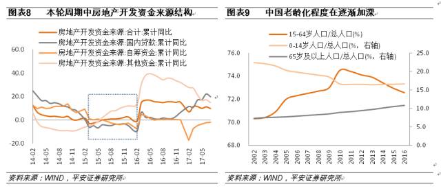 其一,本轮房地产销售的改善之初表现较为疲弱,并在2015年下半年出现了一定的反复(销售增速震荡及回调),因此在地产销售“减速下跌”的2015年全年,房地产企业筹资与投资的动力都较为薄弱。一个证据是,房地产开发资金来源结构中,“其他资金(来自定金、预售款、个人按揭贷款)”随着地产销售的好转而有所回升,但“国内贷款”与“自筹资金”增速均持续低位震荡,显示房地产企业主动融资的意愿薄弱。而房地产企业则大多等到销售出现显著的正增长之后,才开始进行投资的扩张。其二,本轮房地产销售增速的回升,或多或少受到供给侧去库存政策的影响,房地产企业对于本轮地产周期的复苏存在质疑,只有在确定价格上涨持续的情况下,才开始补充库存与扩大投资。其三,从房地产行业本身的长期发展来看,中国劳动力人口占比已在2010年前后拐头向下,城镇化进程最快的阶段已经过去,随着老龄化程度的不断加剧,房地产行业已逐步进入发展的中后期。从本轮销售、投资等各项增速的峰值来看,已经显著低于前两轮周期所达到的高度,可见房地产发展的大趋势正在逐步向下。