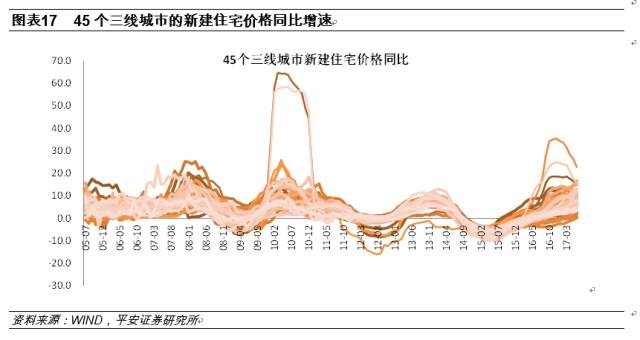 整体来看,一二三线住宅价格上涨具有明显的“示范效应”,一线城市反弹快涨幅高,二线城市紧随,三线城市最后上涨。就上涨的节奏而言,二线城市与一线城市基本一致,目前上涨开始放缓,三线城市在一二线城市的带动下,目前还在加速上涨。
