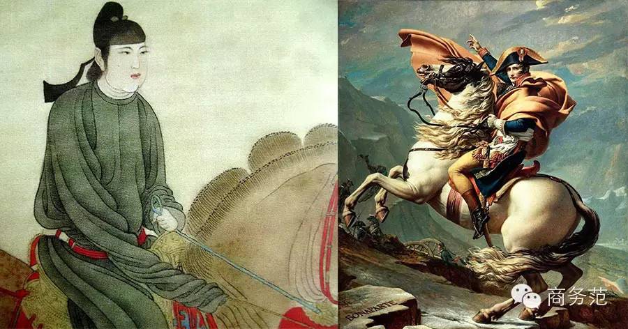 △《虢国夫人春游图》和拿破仑画像放在一起看中西方就很明显了。面部轮廓、服装风格、甚至是马匹的感觉都完全不同。