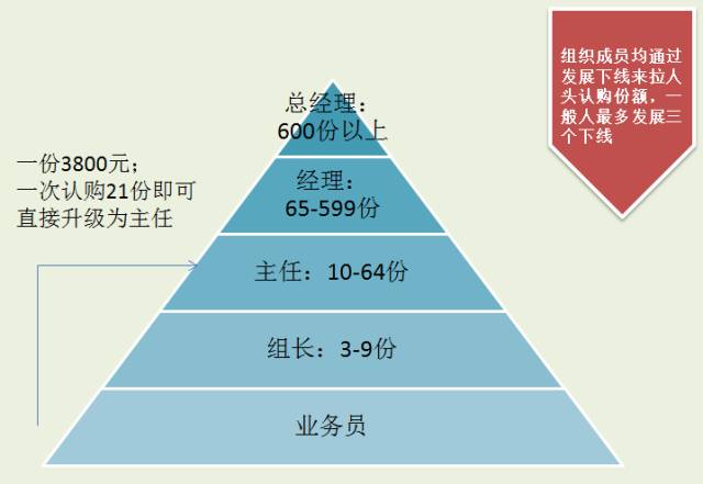 组织结构分为总经理、经理、主任和最基层的业务员,显出它们的“专业性”和“可信度”。成员通过发展下线来拉人头,从而认购份额,份额越多职位越多,取得的返利就越多。